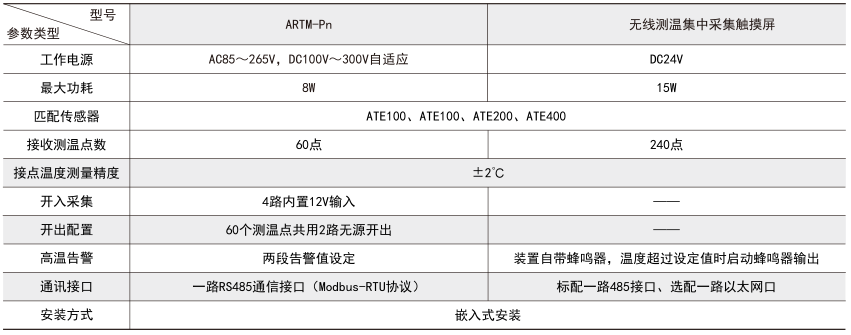 ARTM-Pn無線測溫裝置:ARTM-Pn無線測溫裝置可以單獨安裝在高壓柜、低壓抽屜柜內(nèi),每臺裝置可以接收18個傳感器的數(shù)據(jù),傳感器型號可選配ATE100、ATE200、ATE300。裝置帶有一路485接口,可將采集到的溫度數(shù)據(jù)上傳到監(jiān)控中心。