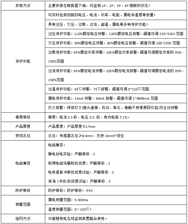用于對用電線路的關(guān)鍵電氣因素,如電壓、電流、功率、溫度、漏電、打火、能耗等進行實時監(jiān)測,具有預警報警、電能計量統(tǒng)計、故障定位等功能。