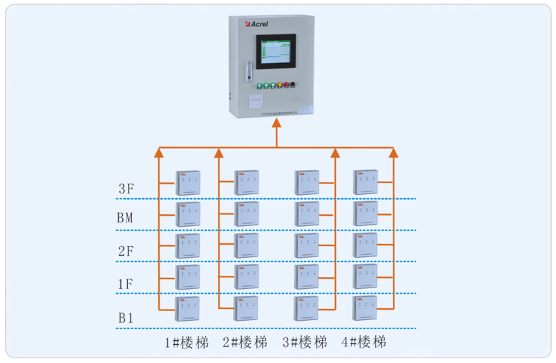 系統(tǒng)采用安科瑞防火門監(jiān)控系統(tǒng),該系統(tǒng)主要采用分層分布式網(wǎng)絡結(jié)構,系統(tǒng)結(jié)構為:站控管理層、網(wǎng)絡通訊層和現(xiàn)場設備層。其中黃巖博物館項目現(xiàn)場設備分布為B1至3F常閉防火門。該系統(tǒng)監(jiān)控所有樓道內(nèi)的常閉防火門且實時監(jiān)測防火門狀態(tài),如有異常會后臺報警。所有監(jiān)測模塊通過二總線鋪設至消防控制室,防火門監(jiān)控主機從而完成對監(jiān)測模塊的采集并監(jiān)控。