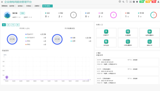 為平臺主界面,針對于企業(yè)微電網(wǎng)的源、網(wǎng)、荷、儲、充的各個關(guān)鍵節(jié)點安裝監(jiān)測、分析、保護、治理裝置, 通過高性能邊緣計算網(wǎng)關(guān)采集數(shù)據(jù)并上傳至企業(yè)微網(wǎng)平臺。平臺根據(jù)新的電網(wǎng)價格、用電負荷、電網(wǎng)調(diào)度指令等情況, 調(diào)整各系統(tǒng)控制策略并遠程下發(fā),使企業(yè)微電網(wǎng)始終高效穩(wěn)定運行,降低企業(yè)用電成本,實現(xiàn)能源互聯(lián)、信息互動。