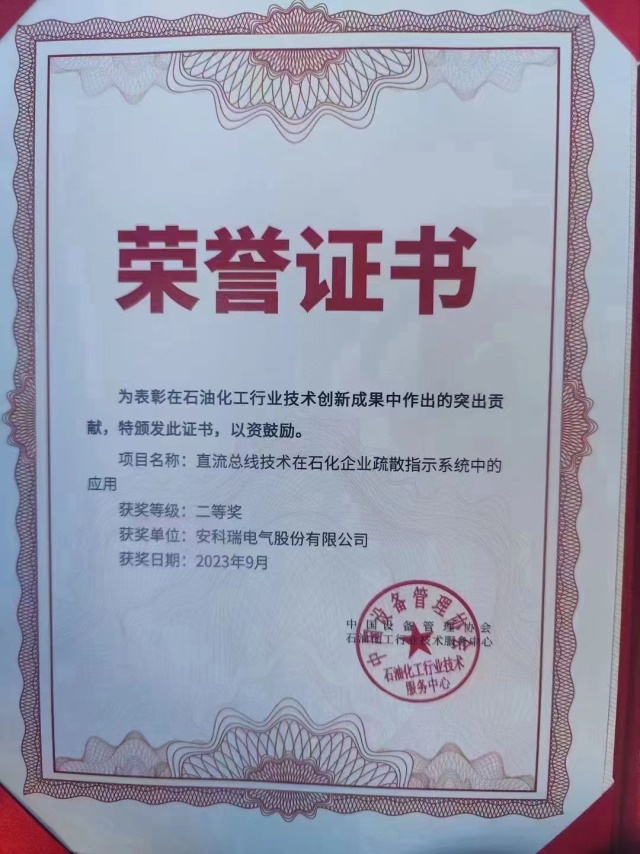 安科瑞受邀參會,安科瑞直流總線技術(shù)在石化企業(yè)疏散指示系統(tǒng)中的應(yīng)用項目榮獲石油化工行業(yè)技術(shù)創(chuàng)新成果二等獎。